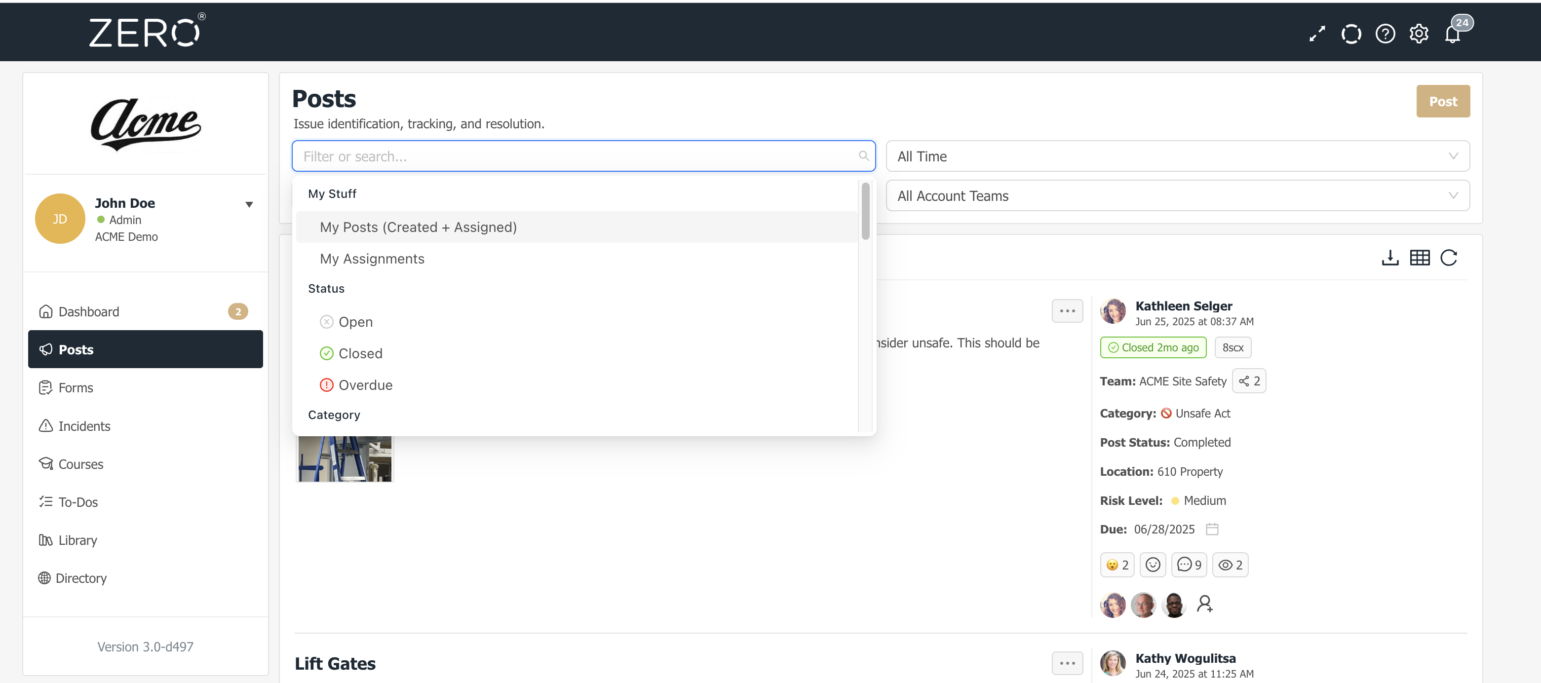 At the top of all main pages in ZERO, there is a filter and search dropdown area. On the Feed, you will see a dropbox box with the text "Apply filter or search...".